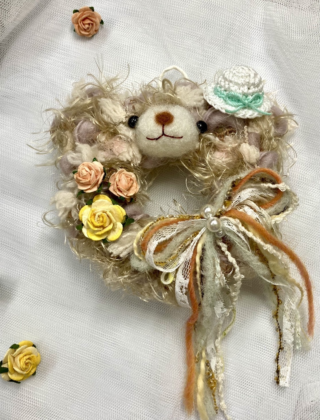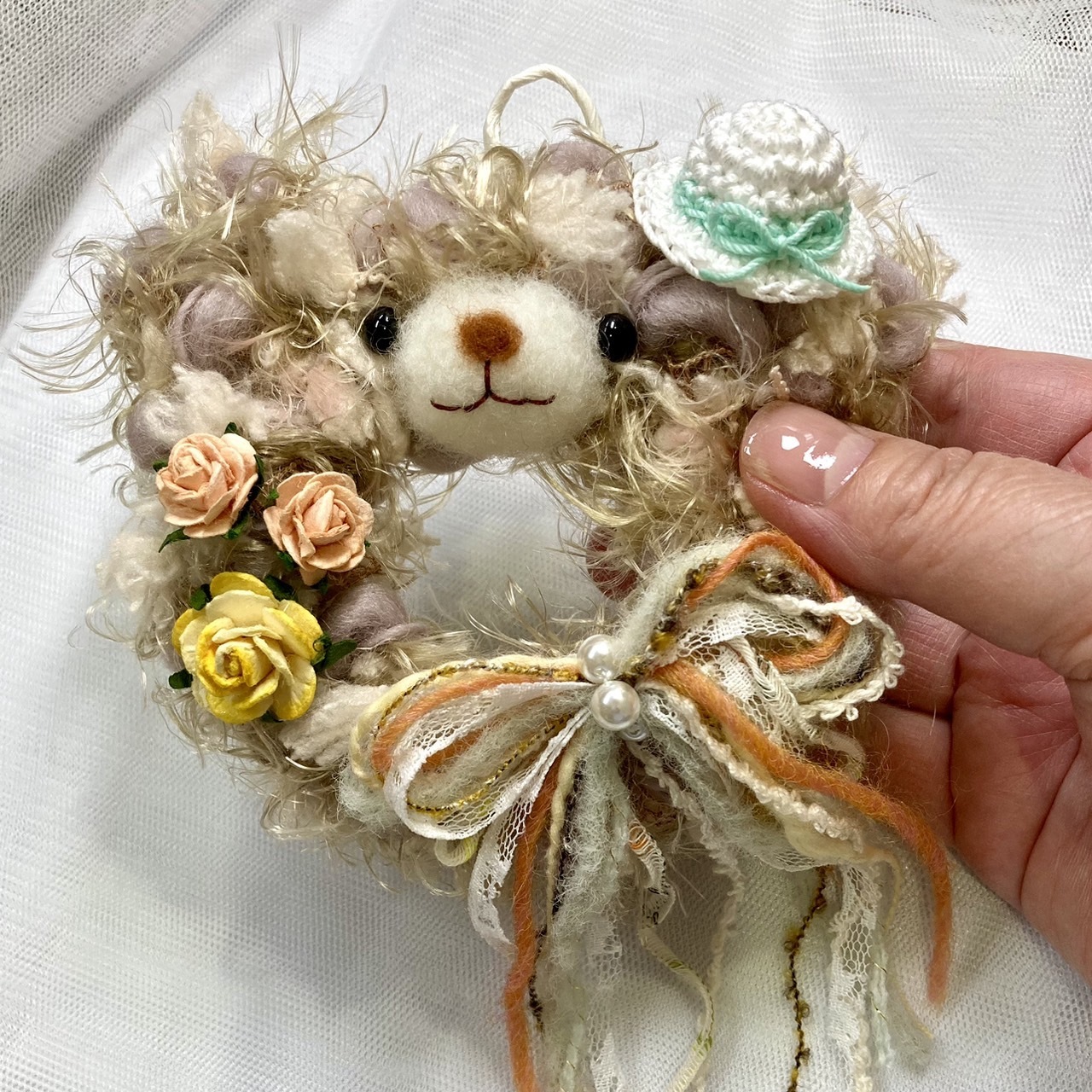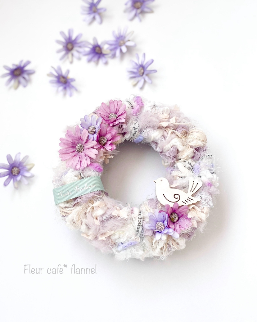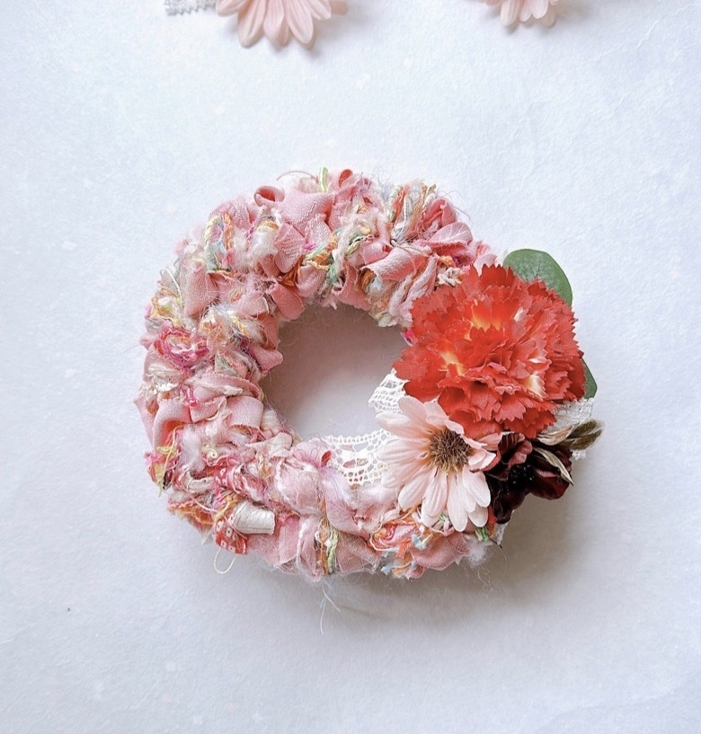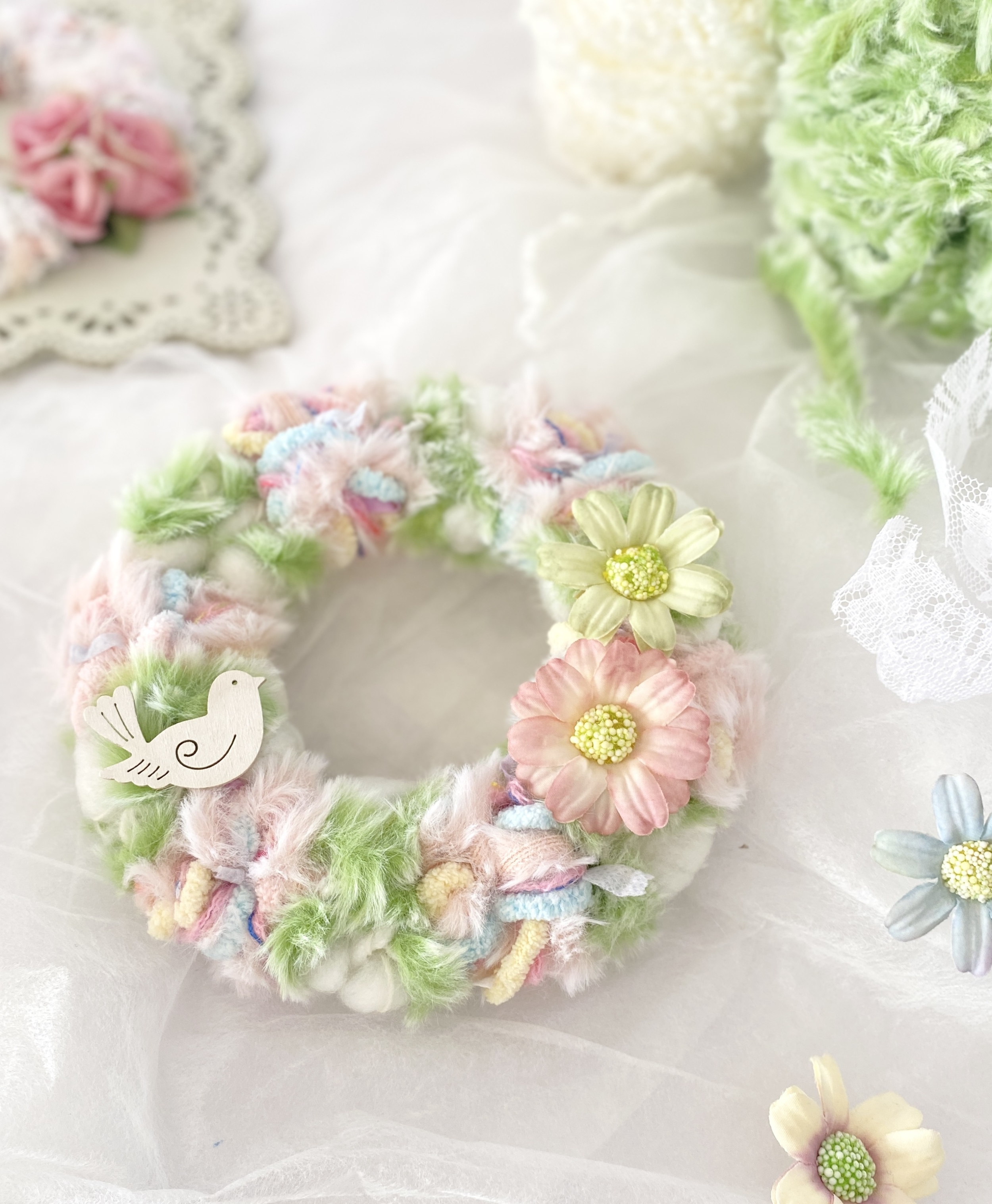 パステルカラーのふわふわミニリースをチャームに仕上げます。