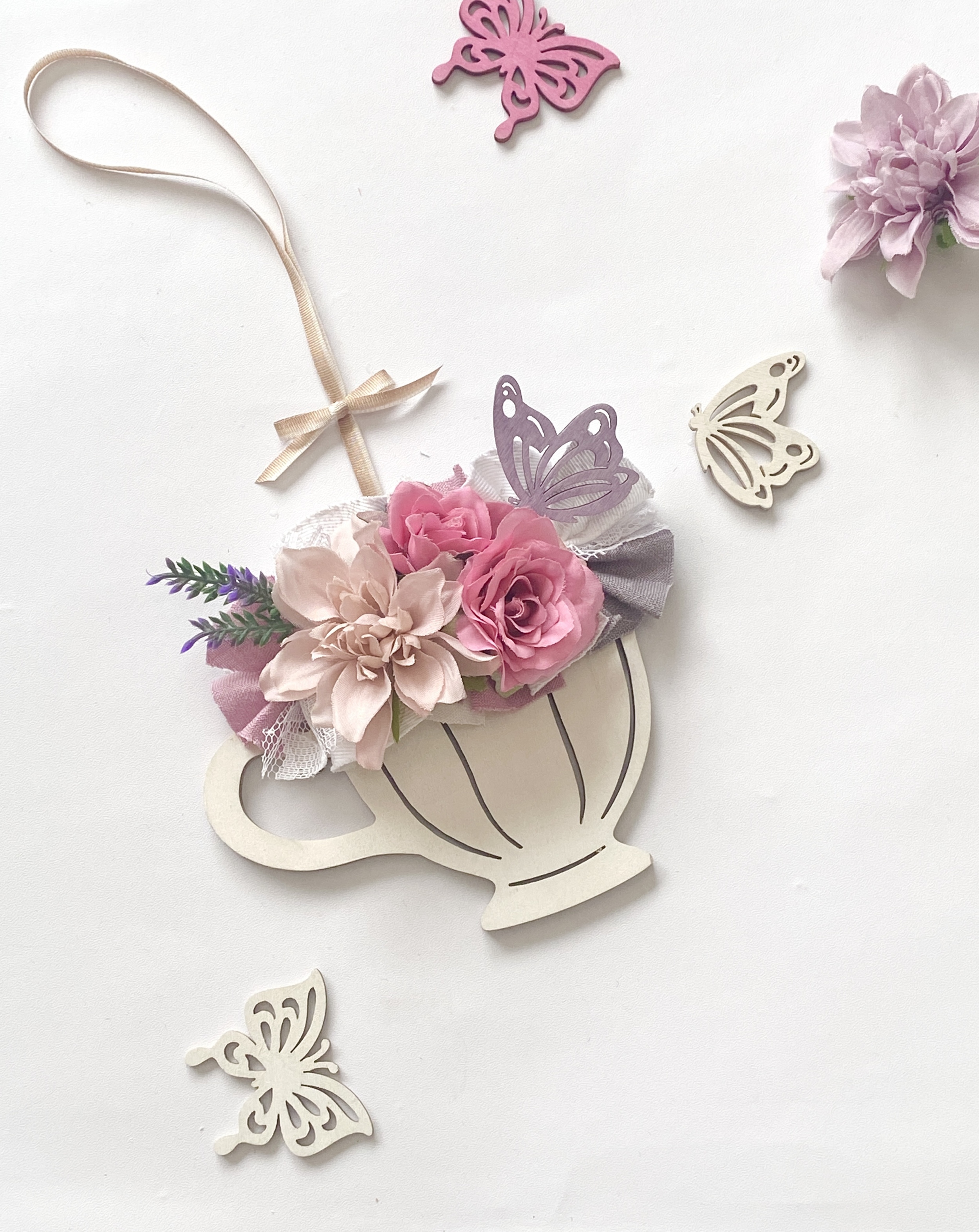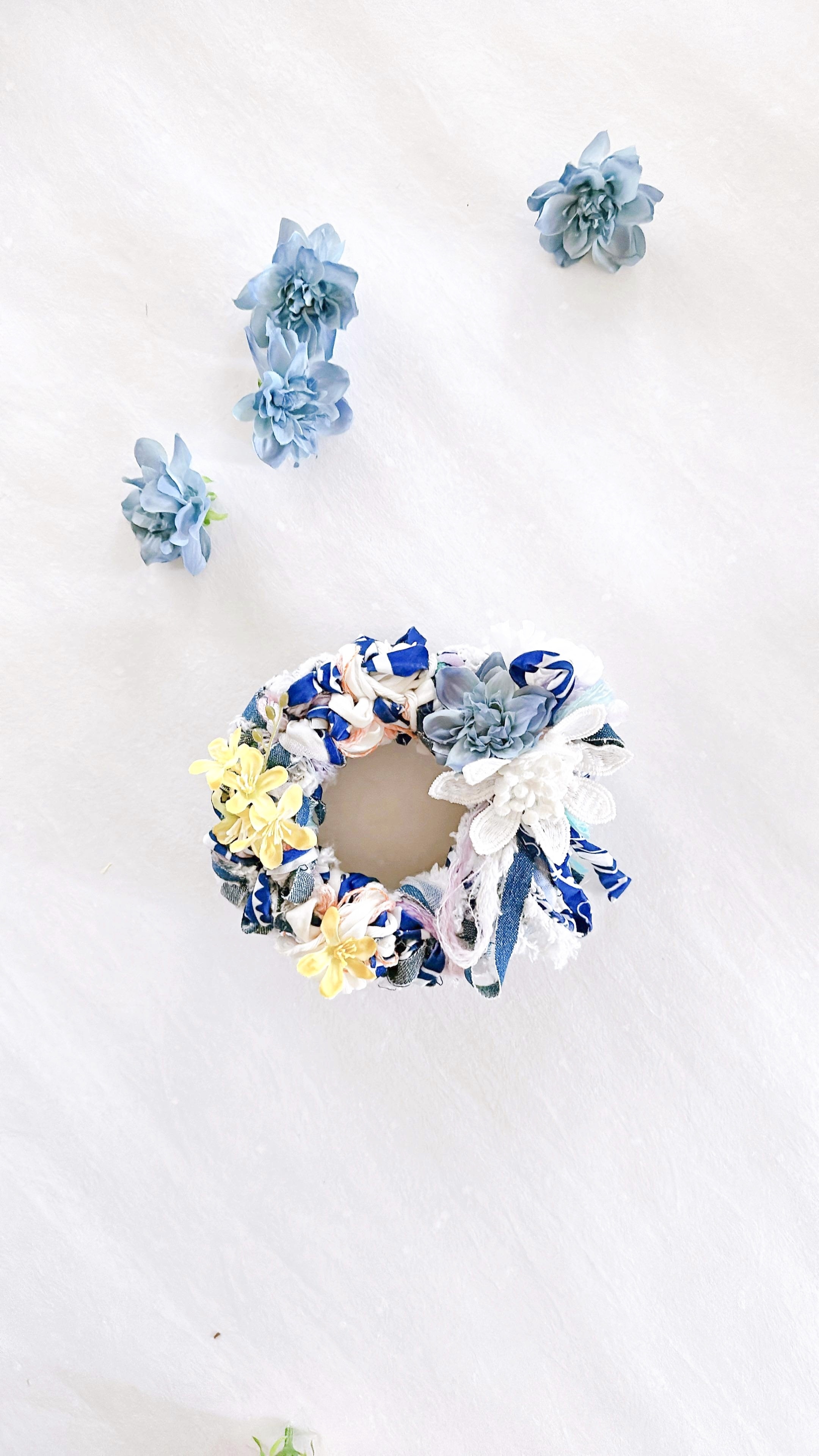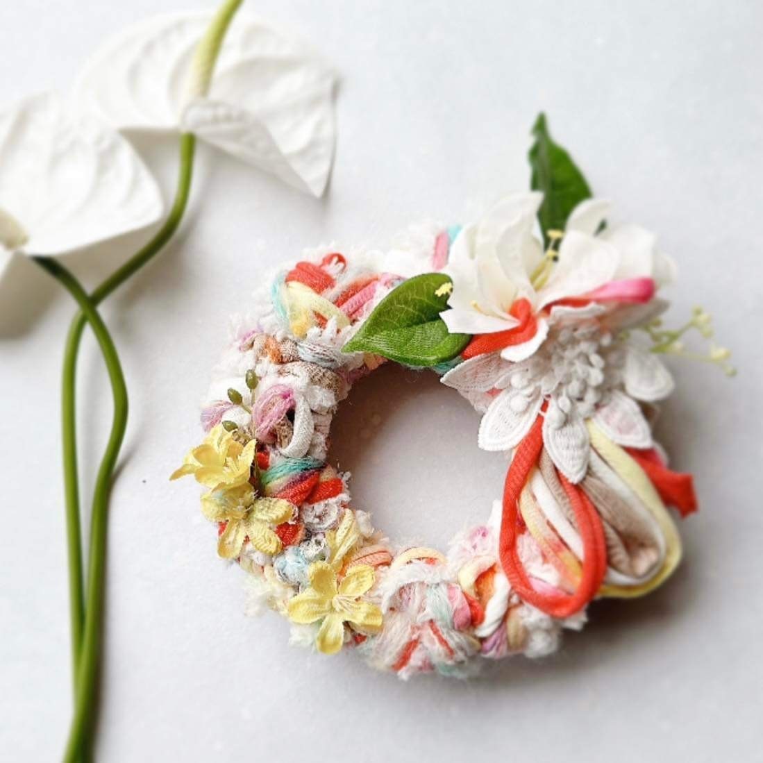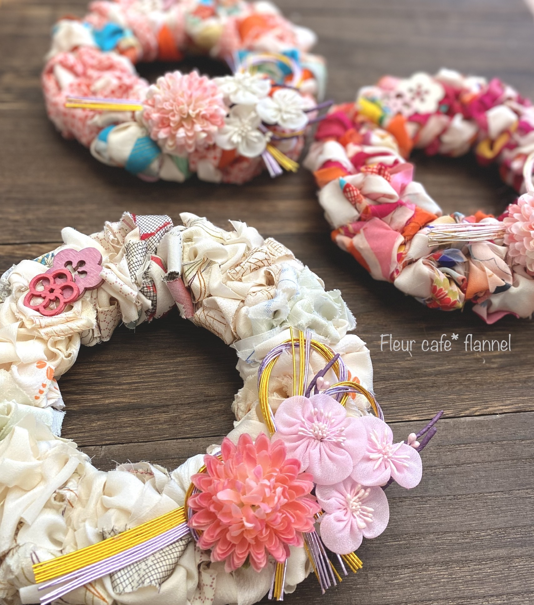 パステルカラーのふわふわミニリースをチャームに仕上げます。