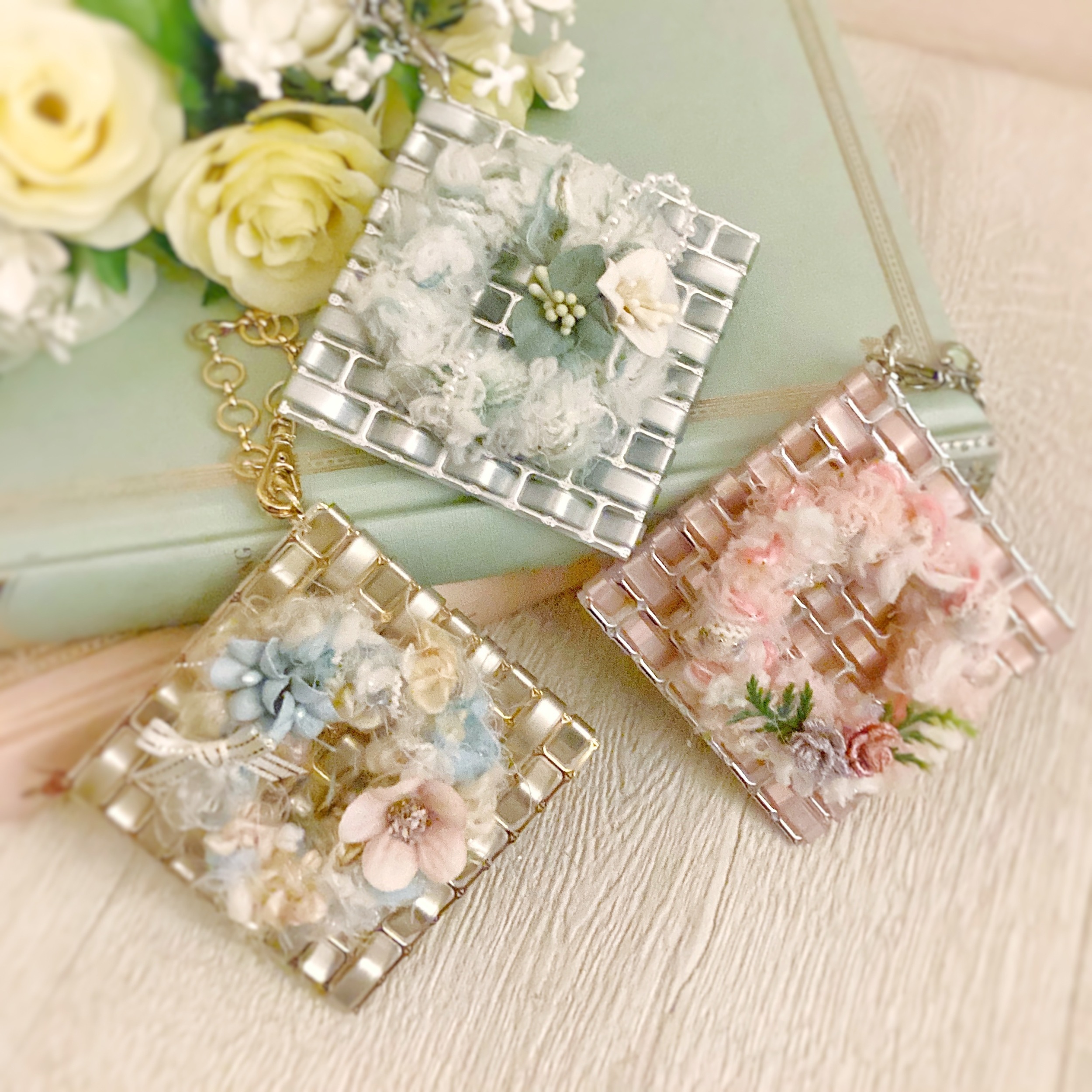 ジュエリーバッグ技法で手づくりしたキラキラ土台にふわふわパーツや花をあしらって自分好みにカスタマイズ!